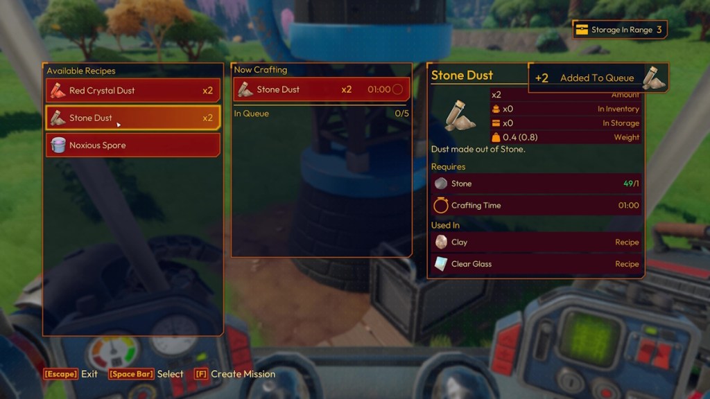 Using the Grinder, making Clay is easy in Lightyear Frontier. You first need to grind Stone into Stone Dust. Enter the Grinder menu and click on ‘Stone Dust’ in the ‘Available Recipes’ list. You make two Stone Dust with just one Stone, but you have to wait a minute for the Grinder to do its thing. The Grinder will work on one Stone Dust at a time, but you can add five more to its queue. It will keep pumping out materials until the queue is empty.