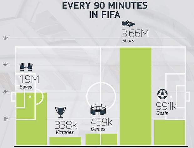 Together, we’ve contributed to the 459,000 FIFA 14 games being played around the world every 90 minutes. A new infographic from EA says that 3.66 million shots are made in the same amount of time. And if you know your players, Cristiano Ronaldo is the top goal scorer, with 35.2 million goals so far.