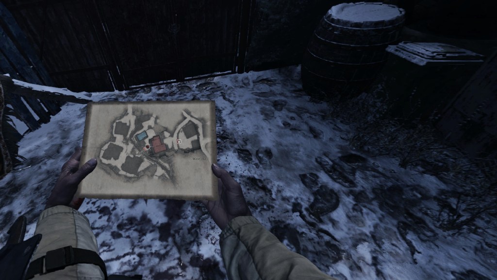 There’s shoulder grabbing for bigger weapons like shotguns, your pistol is on your hip, the knife is on a strap on your wrist: but Village takes things one step further by cramming stuff into your jacket (you need to grab and open either side for specific items). Basically everything is mapped to some some of control option on Ethan’s person, including an in-game item map (instead of a menu) that defaults to your back left pocket. First aid is administered by grabbing a bottle from behind your left shoulder, popping the cap off with a button press, then pouring it over your body. Dual-wielding is possible, and double pistols is especially viable. Using the knife and putting your hands up to block (and holding the triggers and swinging forward to punch) is similarly responsive and easy to learn. Big bonus points to the development team for allowing you to break glass with your fists instead of pulling out the knife each time!