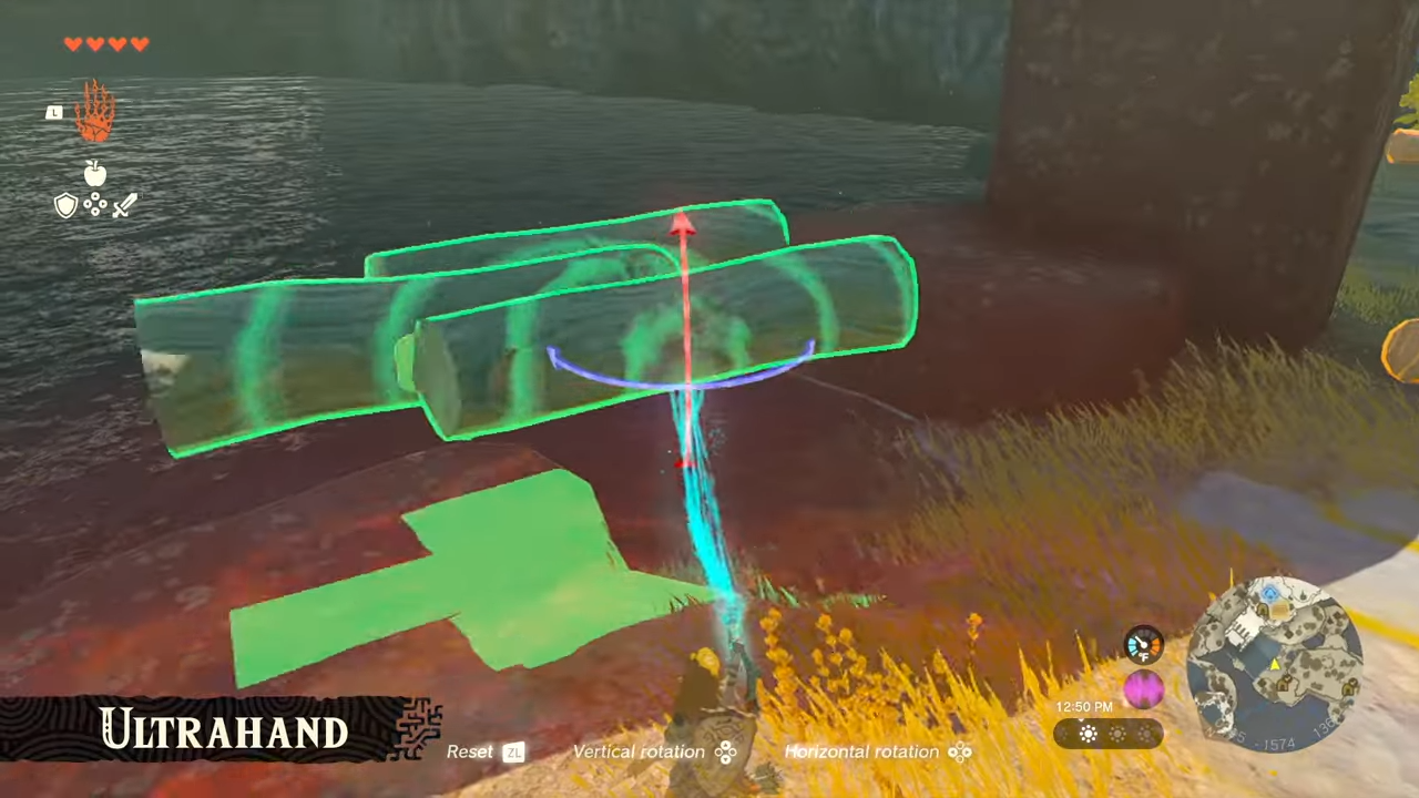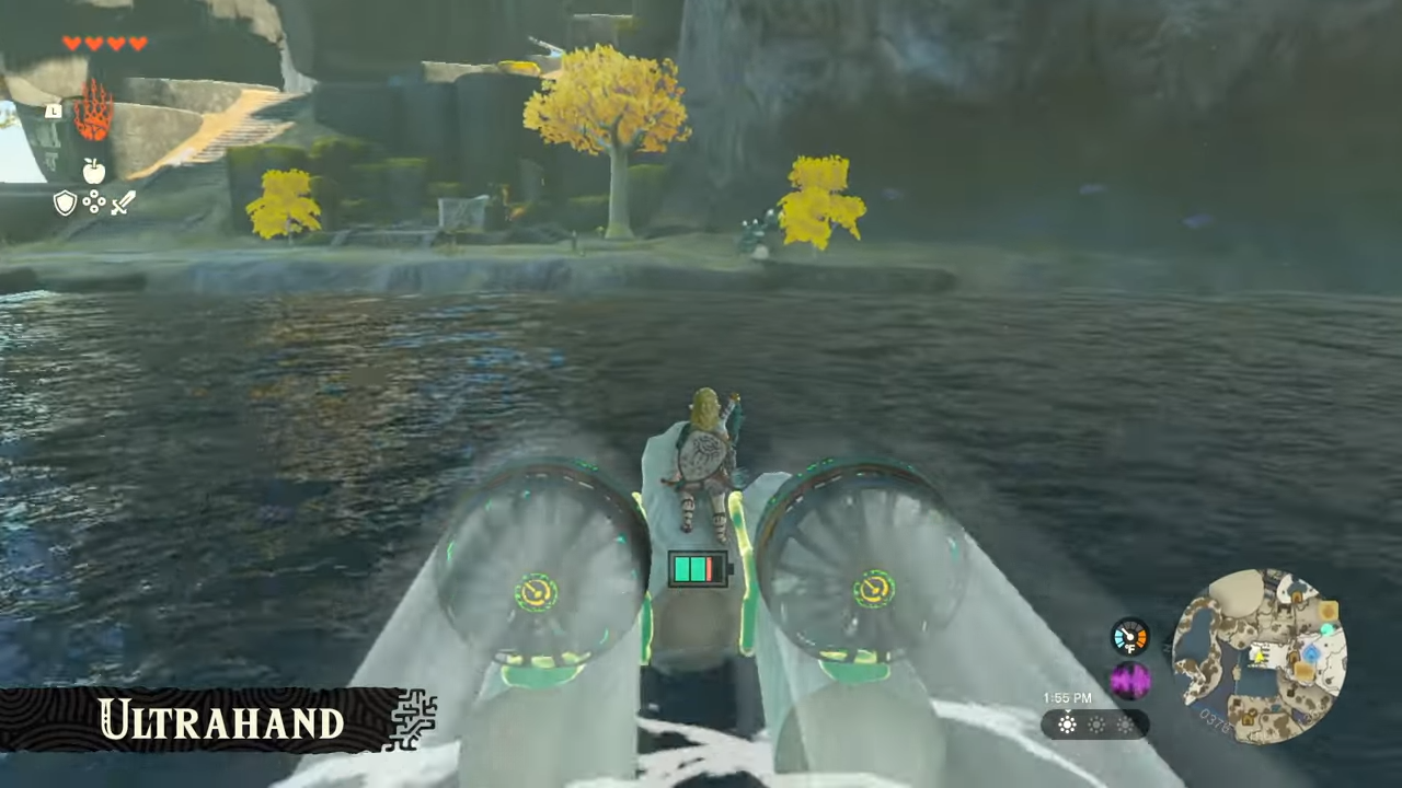 - The demo shows link manipulating logs using the ultrahand power to attach them together to form a boat – a wind machine/fan can be attached to the boat to power it – you can “freely craft” structures and machines
