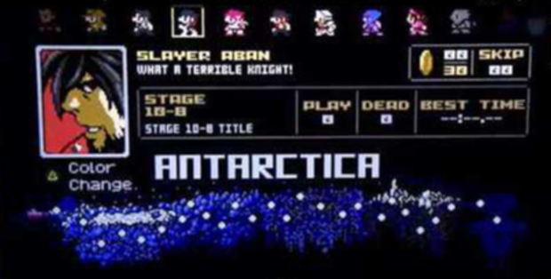 A close inspection of this new playthough of the game reveals a lot of new playable characters, most of whom are protagonist Aban Hawkins in various degrees of cosplay. There’s Slayer Aban (inspired by Castlevania?), Adventure Aban (inspired by Uncharted?), Soldier Aban (inspired by Contra?), Fighter Aban (inspired by Street Fighter?) Knight Aban (inspired by Ghosts ‘N Goblins?), and Ninja Aban (inspired by Ninja Gaiden?). As for all new characters, we get a clear view of El Testigo (“from that one movie“), and a mysterious pale skinned blonde. Who could they be? What does all this mean?