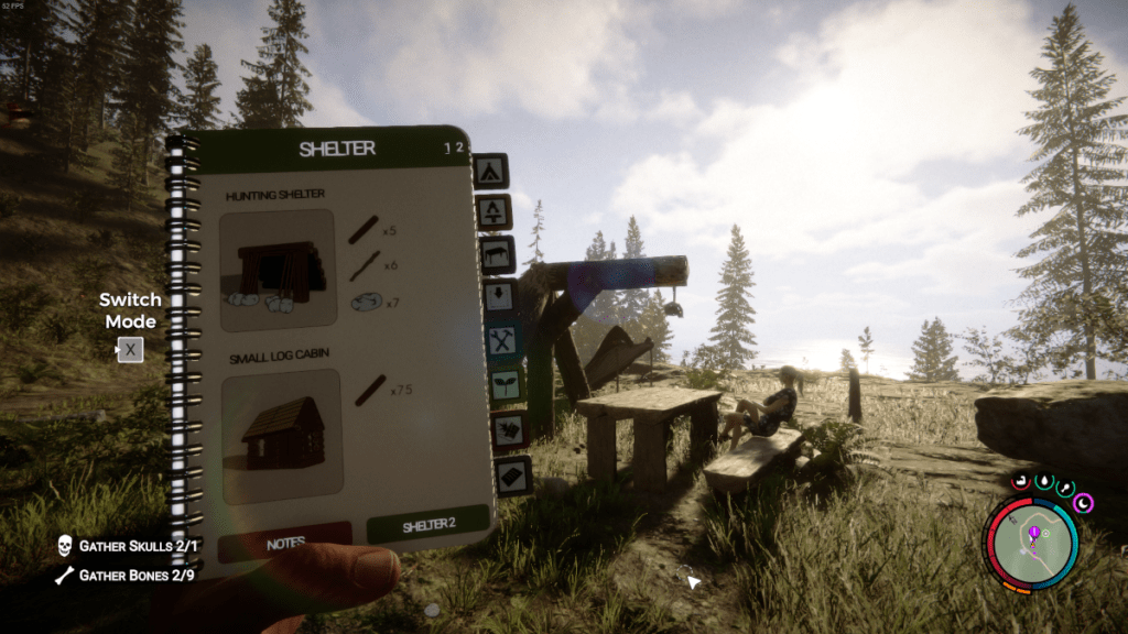 | Hunting Shelter | Upgrade from the basic Tarp Tent, allows a player to save and sleep. | 5 Logs 6 Sticks 7 Rocks |