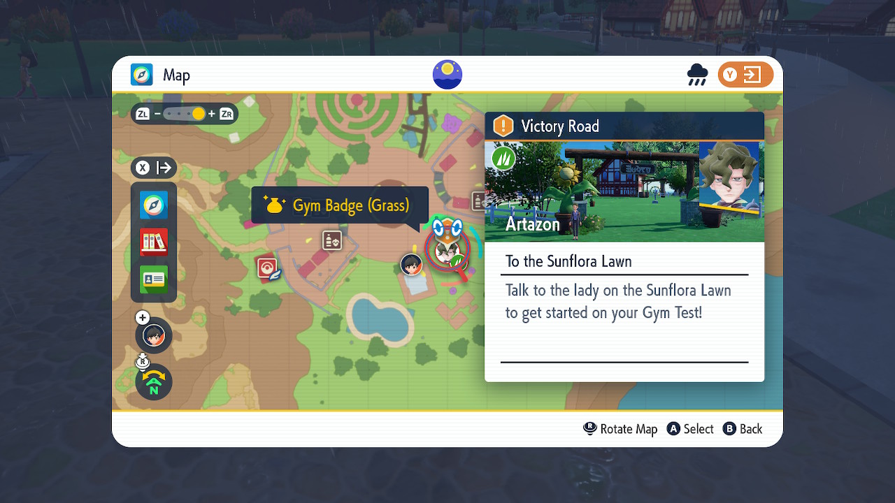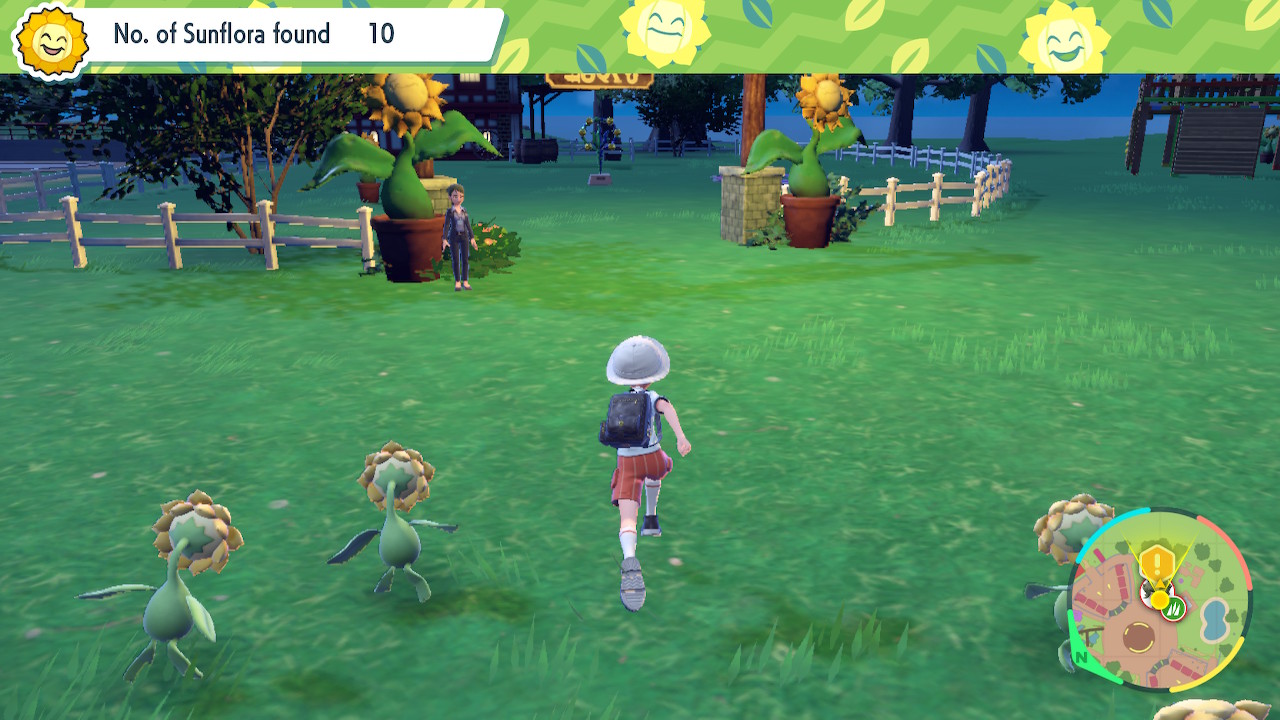 After exiting the gym, look directly to the right and talk to the NPC in front of the pen to kick off the Sunflora Hide-and-Seek gym test. Your job is to gather up 10 errant Sunflora in Artazon, then return to the pen. Do not focus on the pen itself: there are no Sunflora in there.
