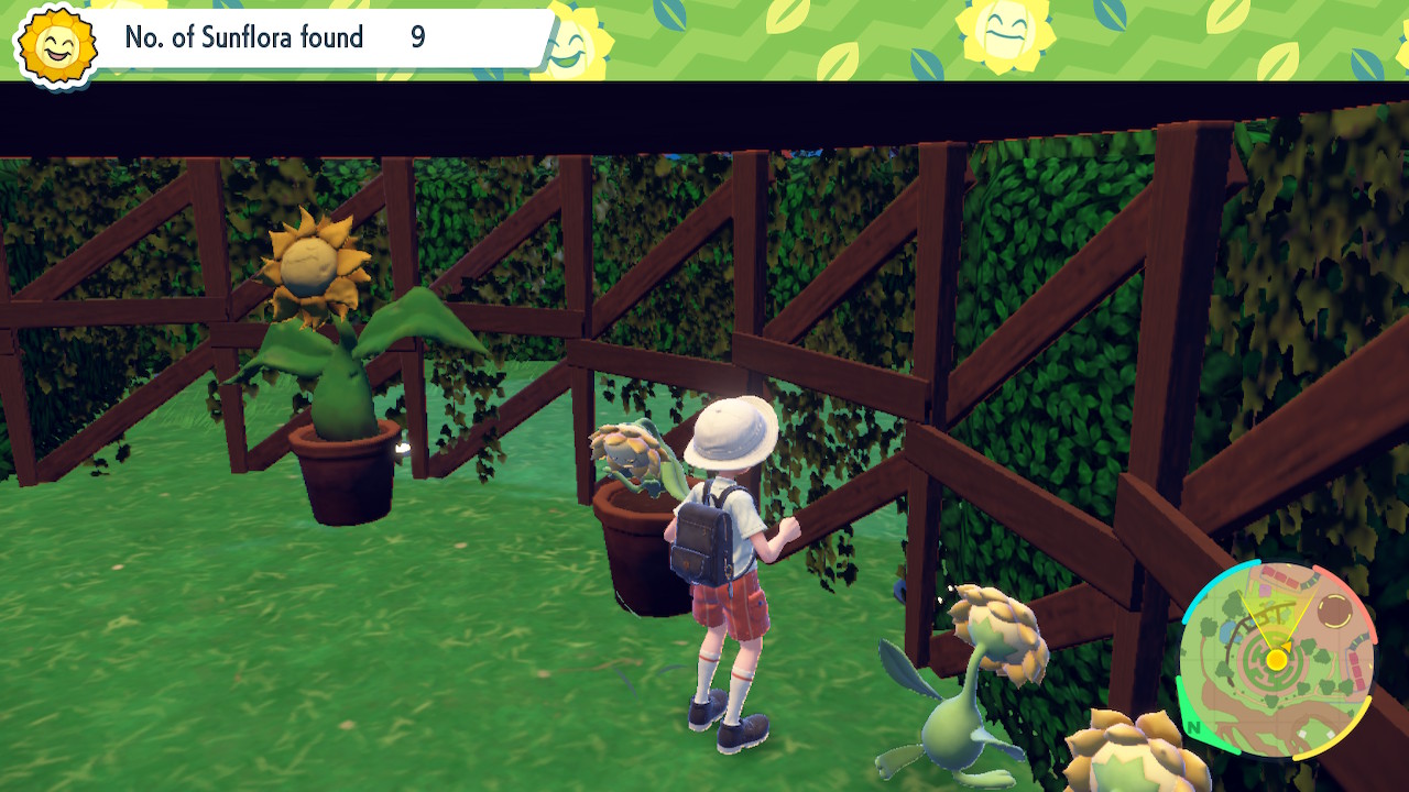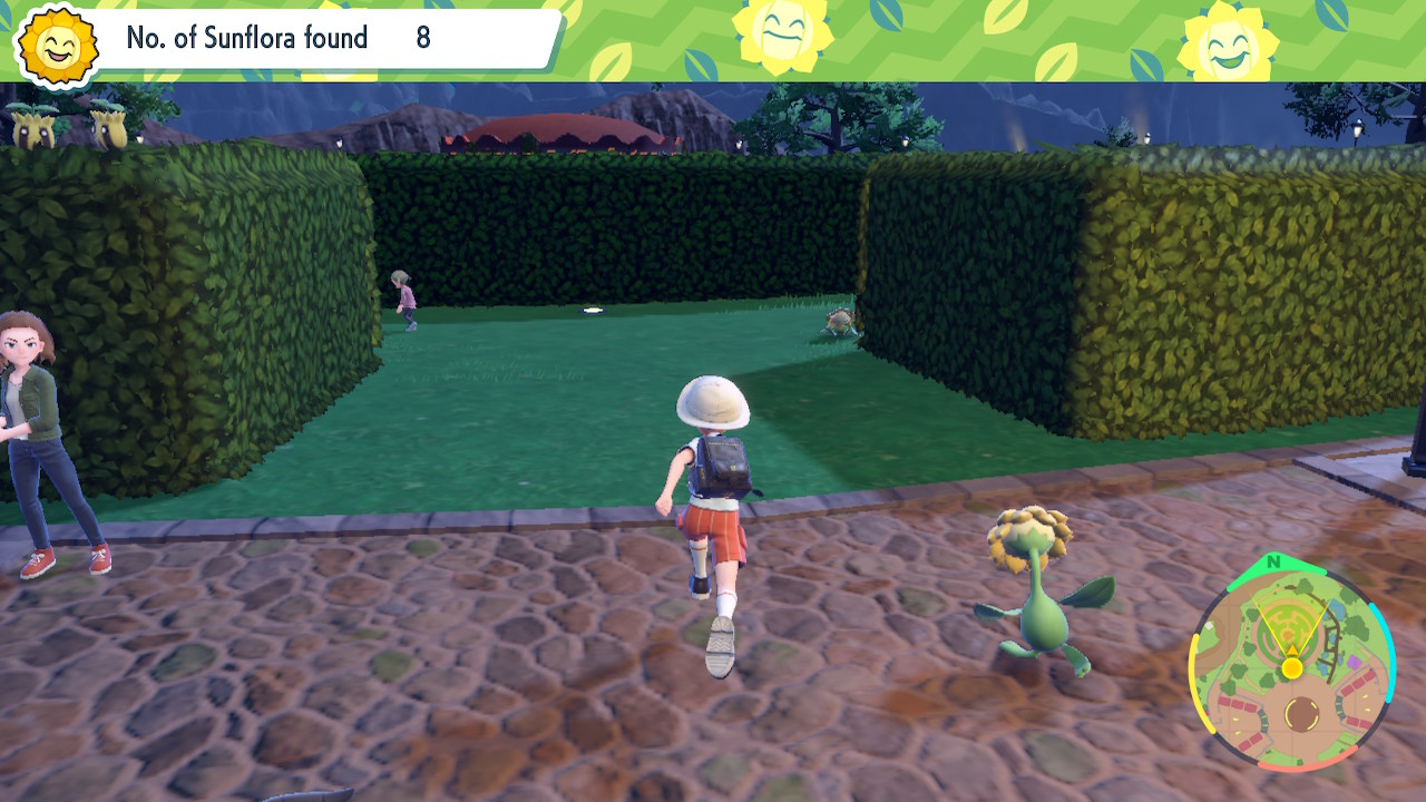 - Turn around and walk over to the garden maze on your left. There’s actually two Sunflora in here. One is sleeping near the entry point, and another is at the very end (go right, then left, then left), also sleeping