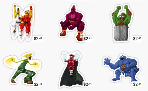 You may think that turning Sesame Street characters into Street Fighter characters doesn’t make much sense as you look over this collection of Sesame Street Fighter stickers, but for some reason it just works. Bert and Ernie as Ryu and Ken? Duh. Cookie Monster as E. Honda? Clearly. And Big Bird as Sagat? I think he’d totally agree with that.