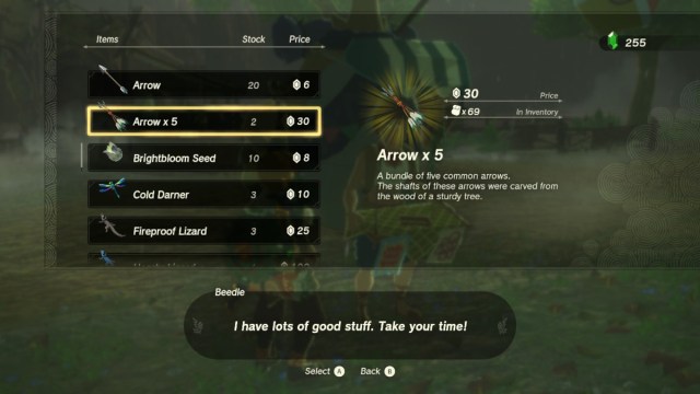 For players with lots of Rupees, it is possible to buy arrows. The shops in various towns usually have some arrows on sale, though Link can only buy limited amounts of them before the store runs out of stock. This can be worked around if players are purchasing from Beedle in the stables. After purchasing arrows from Beedle, simply take a nap at the stable inn. When Link wakes up, Beedle’s stock should be refreshed. Arrows can also be purchased from Yiga HQ, and this appears to be the cheapest place to get them.