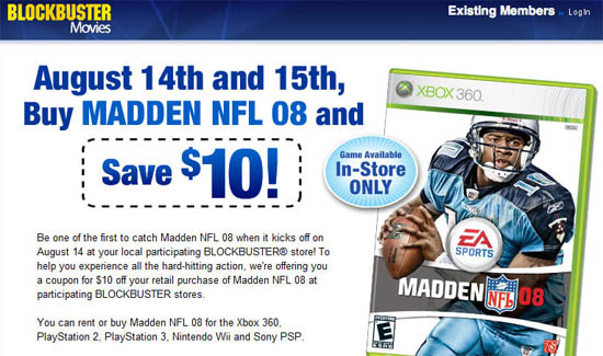 Evil Avatar tells us Blockbuster is using the power of Madden to kick off its new video game selling/trading program, offering Blockbuster Online members a coupon for $10 off any version of Madden ’08.