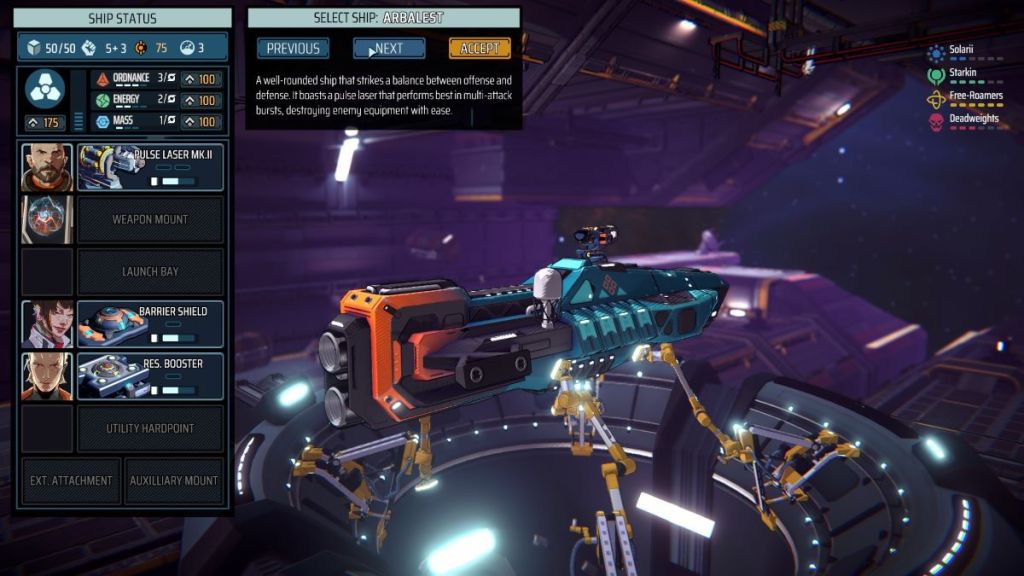 That’s where the card game comes into play. Ship systems, like lasers and shields, supply cards to your deck, and require Ordinance, Energy, and Mass to be played. You’ve got to balance the resources your ship has coming in each turn to defend yourself from incoming attacks and deal damage to your opponent.