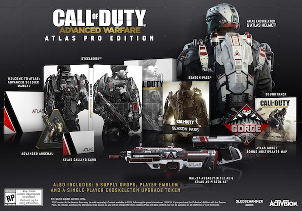 Activision also announced all of the over bloated editions of the game you can get your hands on. First there’s the Atlas Limited Edition for $79.99. This will include one bonus map which re-envisions Call of Duty 4: Modern Warfare’s Pipeline map, plus a Bal-27 AE Assault Rifle, Atlas 45 AE Pistol, themed Atlas exoskeleton suit, helmet, and player card. There’s also going to be five bonus supply drops, and a single-player exoskeleton upgrade token. Lastly this will include a steelbook, manual, and soundtrack.