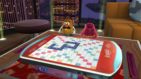 Basically, this means that within the Hasbro Family Game Night shell, you have all of the games associated with the series that you’ve purchased in a cute, animated shelving system. Within this environment is some furniture and chairs and I am told that themes and new furniture will be available as DLC in the future (for a nominal fee, of course). Mister Potato Head runs around in there too.