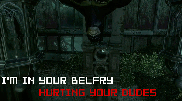 Eidos and Warner Bros. Interactive are calling the stealth bit Invisible Predator. In a nutshell, it appears that you’ll be able to hide in or sneak around various places and utilize “fear takedowns.” I’m guessing that part where Batman, while hanging upside down, grabs a thug is an illustration of a fear takedown. It doesn’t always have to be theatrics — you can also plain jack a dude all Sam Fisher-like if you want.