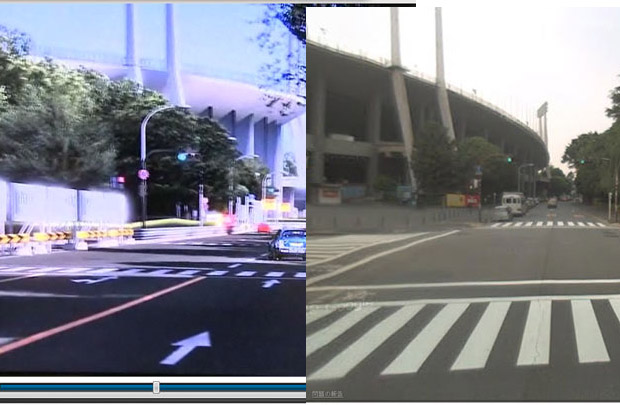 This Japanese blog has side-by-side images of real-world Japanese locales set next to screencaps of a GT5 replay shown at gamescom last week. It looks like Google Maps supplied the other half; f*ck going outside, right? This track is set in Tokyo, in the Akasaka area. The image above compares the side of a stadium there — very impressive.