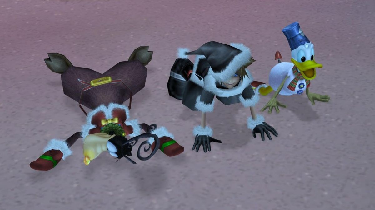 During a playthrough of Kingdom Hearts 2, Sora returns to Halloween Town. However, just like the movie the world’s based on, we visit Christmas Town. Our heroes Sora, Donald, and Goofy get new outfits. Sora has a black Santa hat, Donald looks like a snowman, and Goofy adorns reindeer ears. They look absolutely adorable.