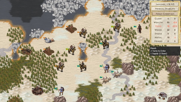 At The Gates is, unsurprisingly, a strategy title set during the final years of the Roman Empire. Beset at all sides by rampaging barbarian tribes, you will control one such tribe in an attempt to carve out your own empire on the ashes of the once mighty Rome.