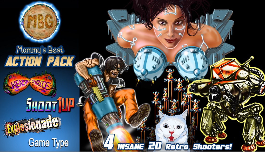 Almost seven years ago, Mommy’s Best Games unleashed Weapon of Choice upon the world. Soon it was followed by Shoot 1up, Explosionade, and Game Type. Xbox Live indies were never the same. Now on Steam, Mommy’s Best Games have unleashed all these awesome titles in the Mommy’s Best Action Pack. For $7.99 you can own 4 of the most unique (and imo, fun) action titles in recent memory. All the games come with new Steam enhancements as well. New achievements, trading cards, leaderboards, retuning, remappable controls and more! Want to see them in motion? Check out this YouTube highlight reel. Want to read a cool interview with Mommy’s Best Games creator Nathan Fouts? Click here. Want to have a chance to win a pack? Well, keep reading bucko!