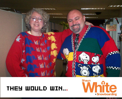 We have five copies of Ubisoft’s Shaun White Snowboarding for the Xbox 360 (the Limited edition Target edition) to give away, so we’ll pick the five worst sweater pictures posted before Monday night next week and award copies.