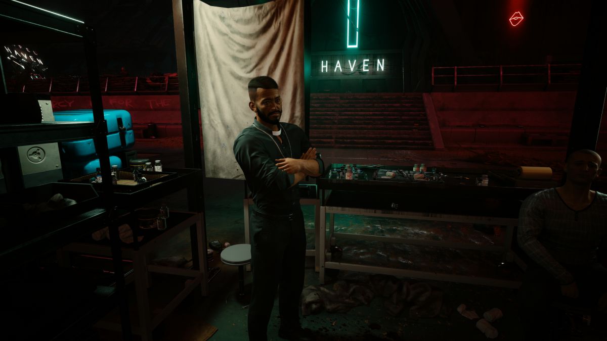 Once you’ve received the brief from Hands, head towards Haven, the clinic in Dogtown. You’ll know it by the glowing neon cross and lettering. Outside, you’ll meet with Odell Blanco, a former priest who works with Anthony Anderson. The clinic has been taken over by scavs, led by a woman named Nika, and you’ve been hired to extract Anderson and settle things.