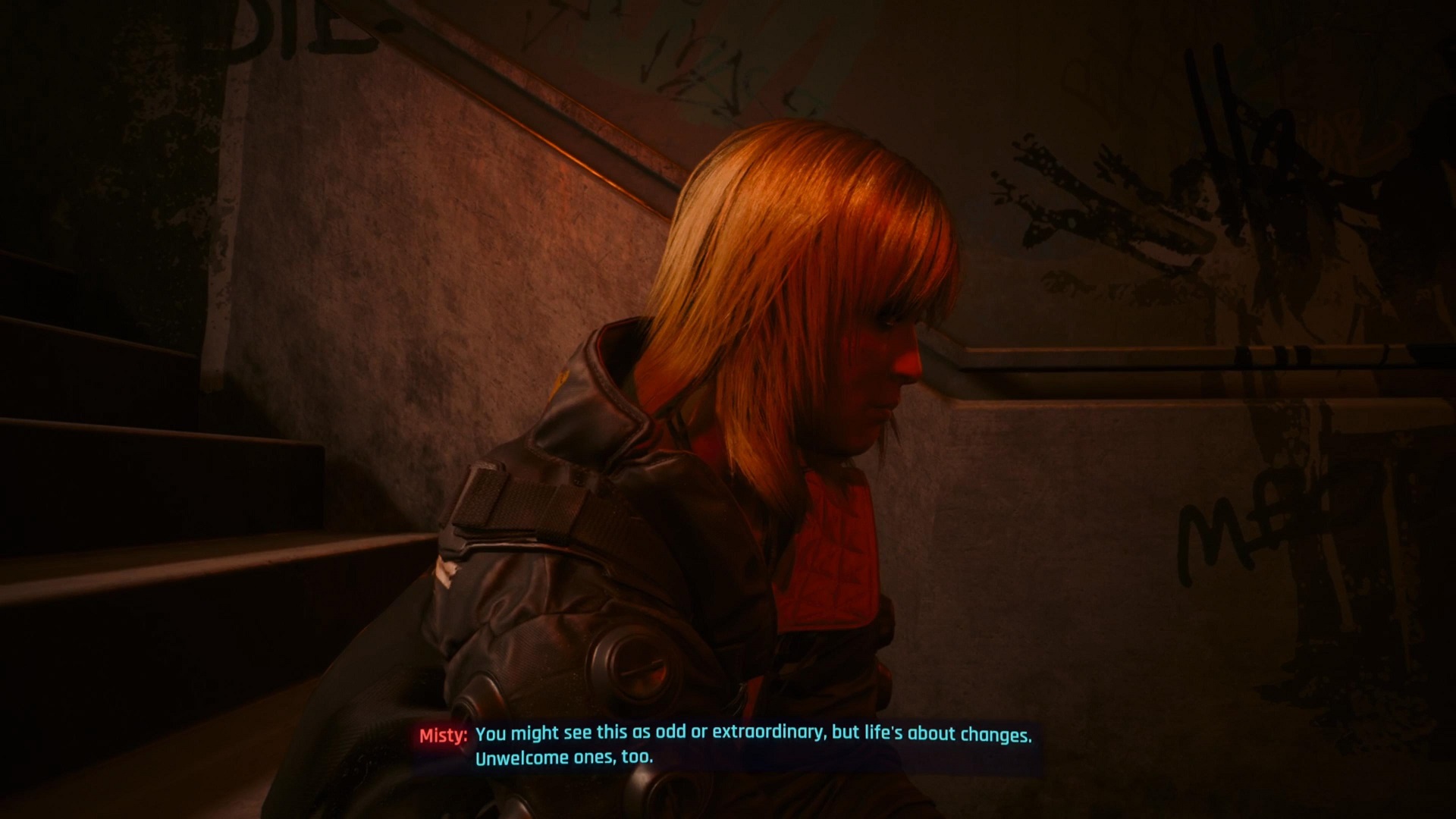 A disheartened V is further beaten down by a pair of no-name thugs who push them down a flight of stairs. It’s there they finally meet Misty who reveals she’s leaving Night City to find herself in Poland.