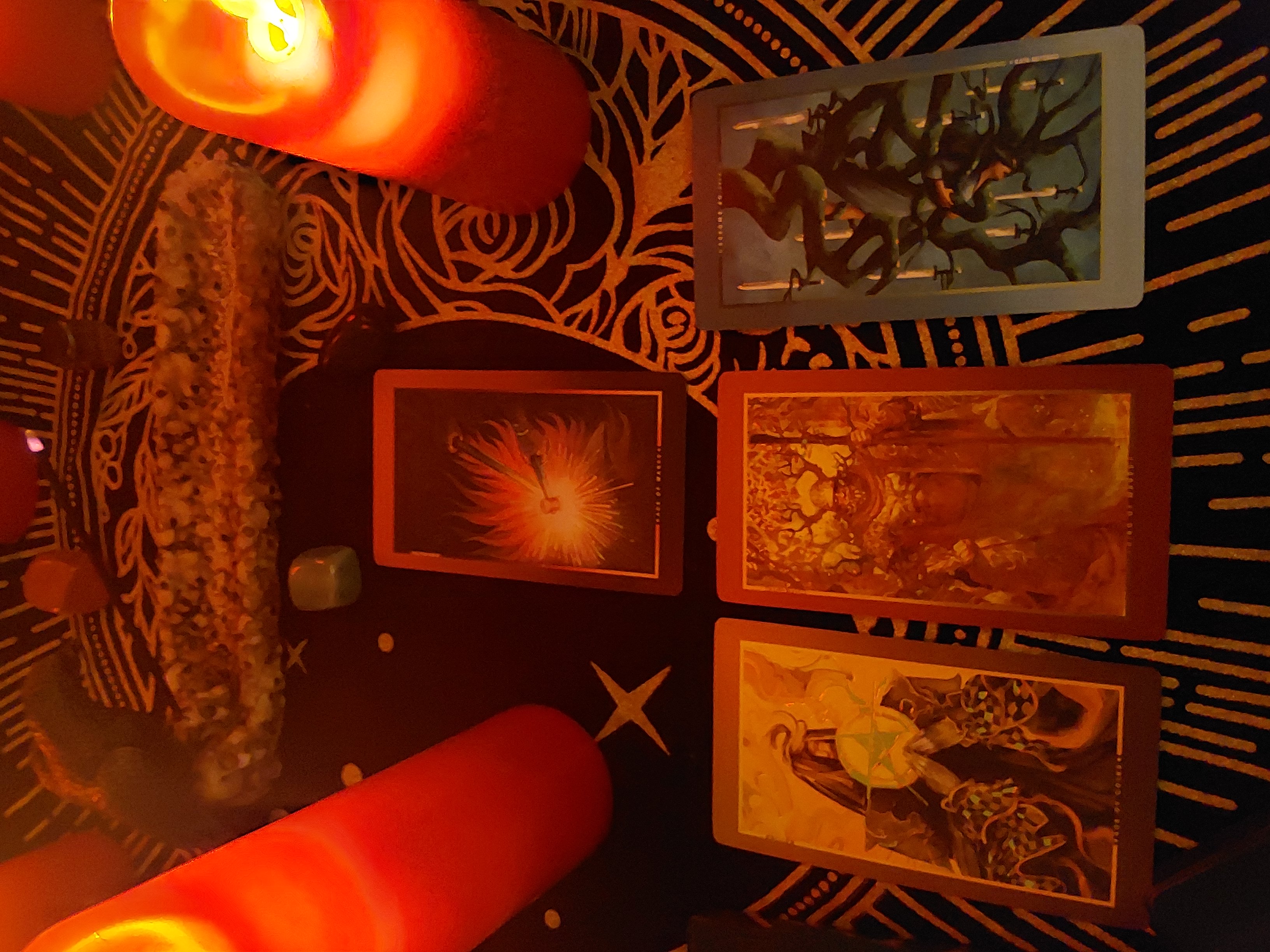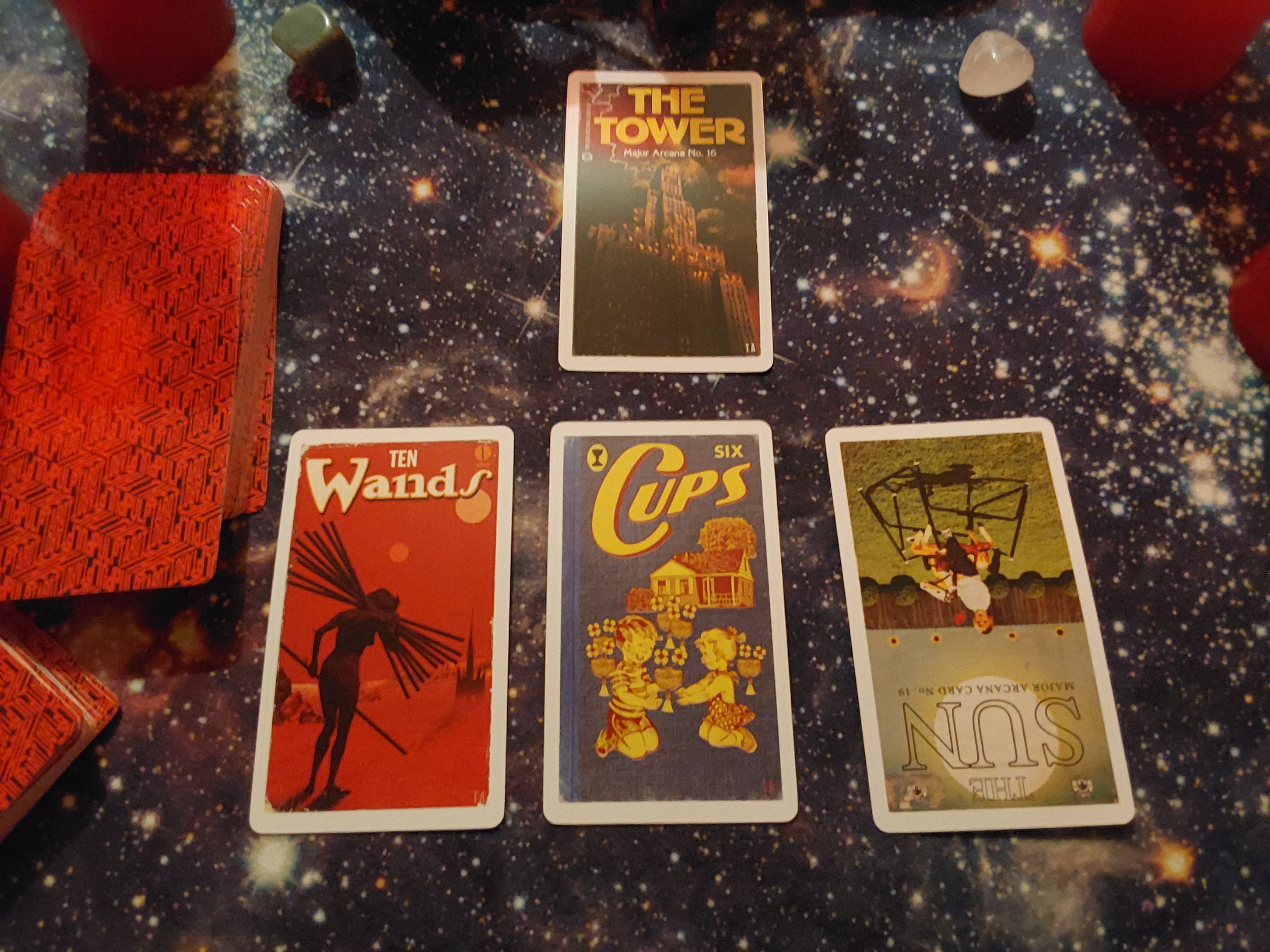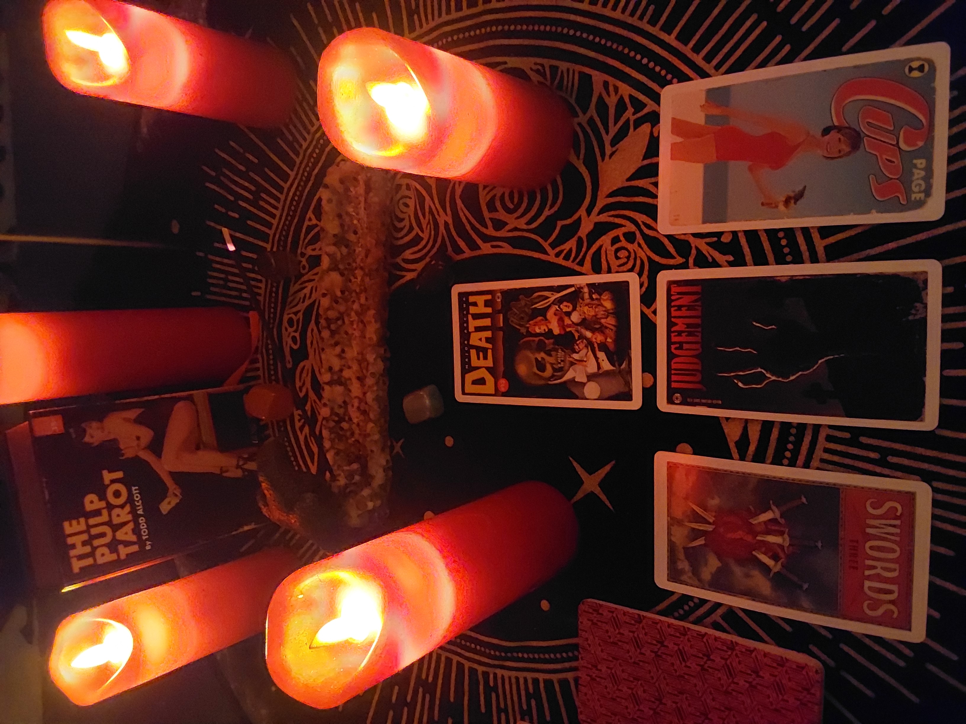 Before we begin, the decks we’ll be using are The Pulp Tarot by Todd Alcott, The Children of Litha Tarot by Xia Hunt, The Corrupted Tarot and The Chromatic Fates Tarot authored by Stephanie Cost, and The Wandering Spirit Tarot by Haenuli Shin.