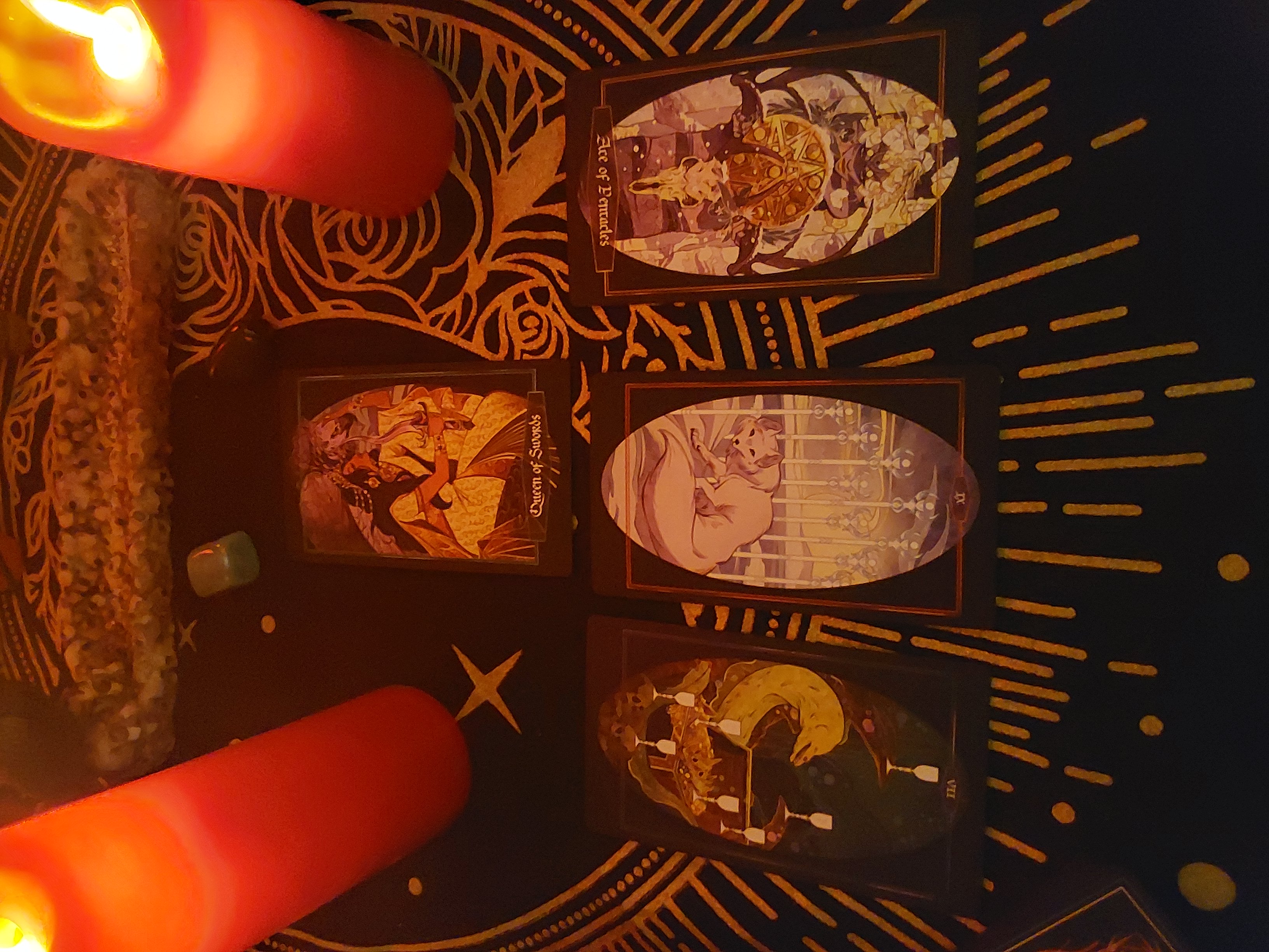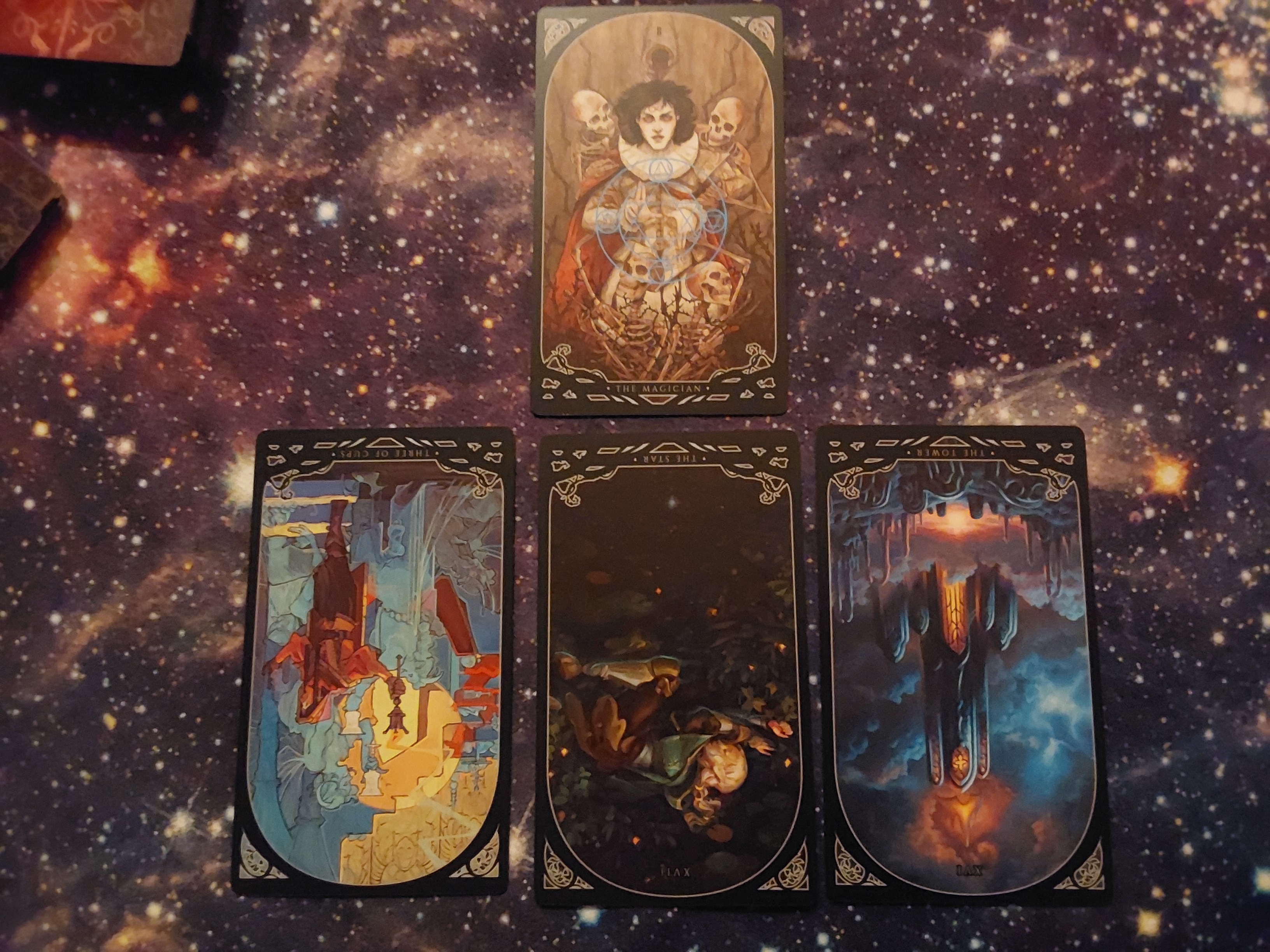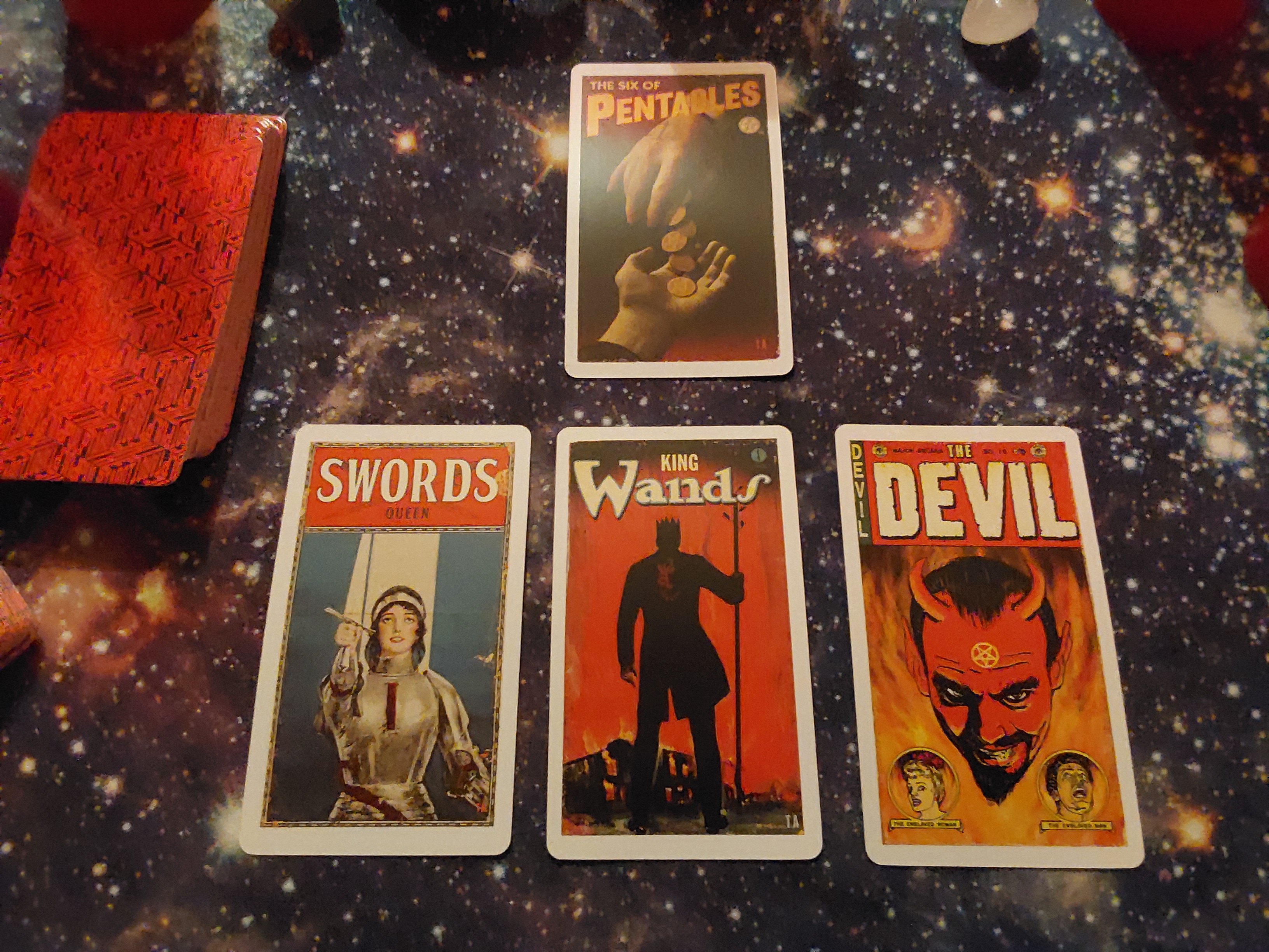 Before we begin, the decks we’ll be using are The Pulp Tarot by Todd Alcott, The Children of Litha Tarot by Xia Hunt, The Corrupted Tarot and The Chromatic Fates Tarot authored by Stephanie Cost, and The Wandering Spirit Tarot by Haenuli Shin.