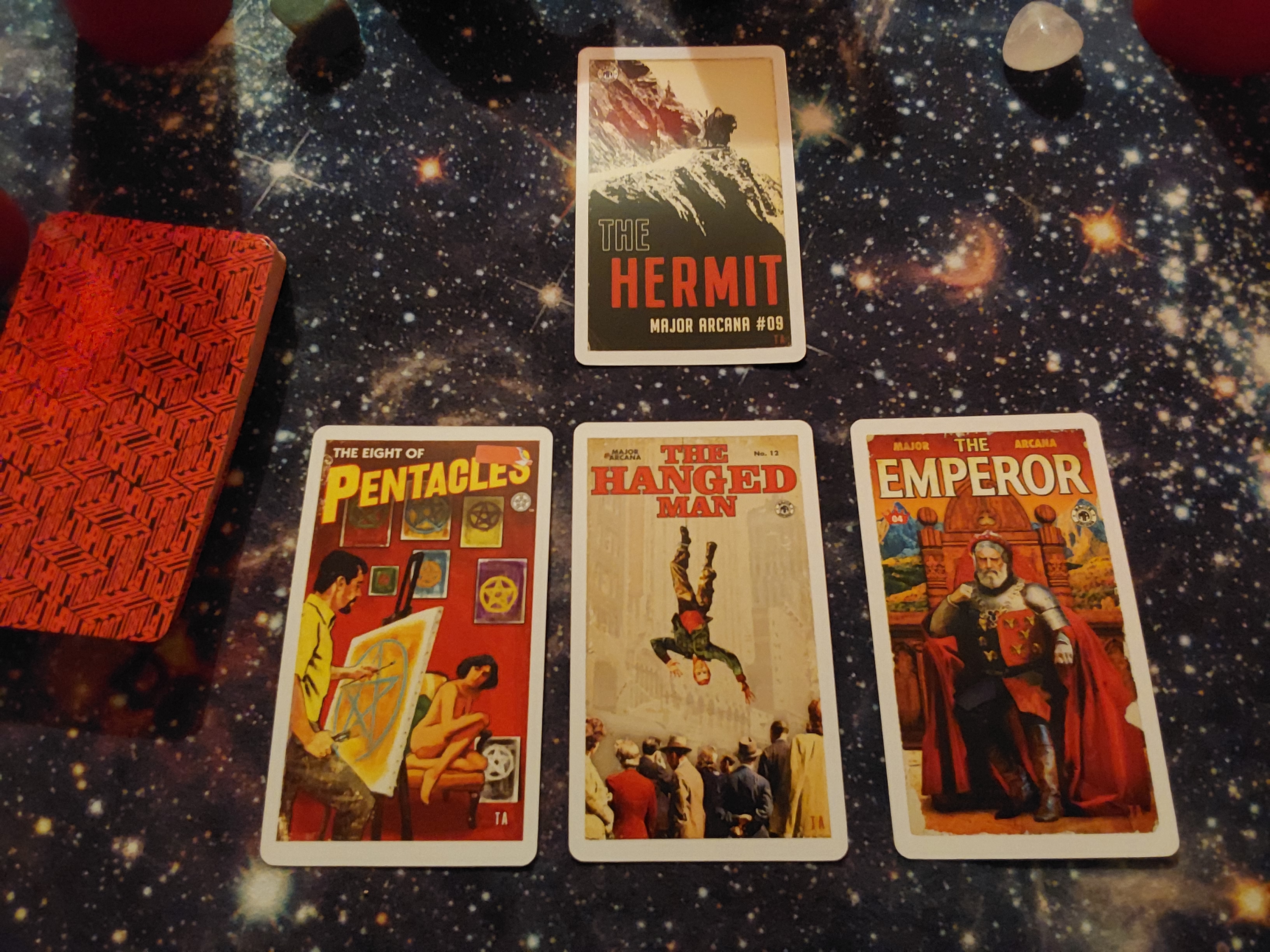 The upended Nine of Wands said there was no spark, no motivation to continue. It is tiring and potate. Finally, the also-reversed Ace of Pentacles means there was no funding or profit in creating it.