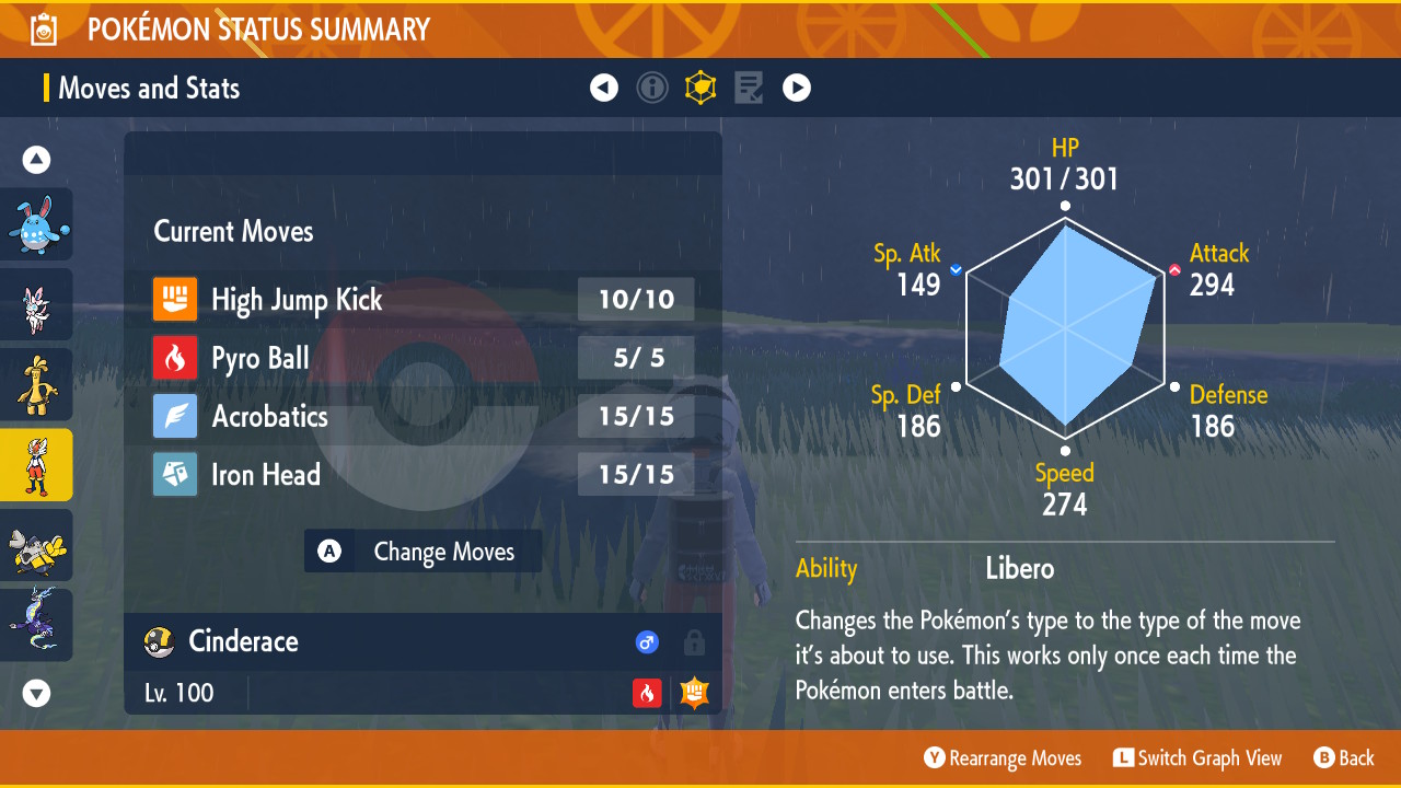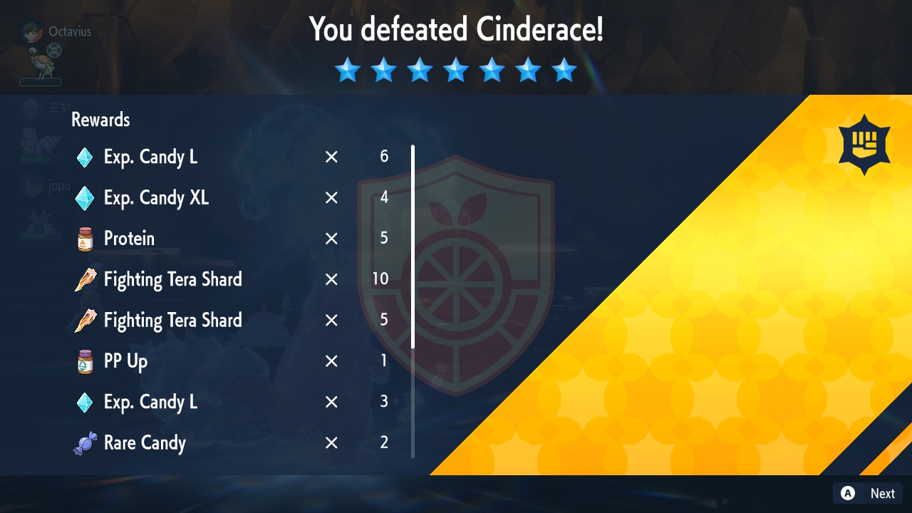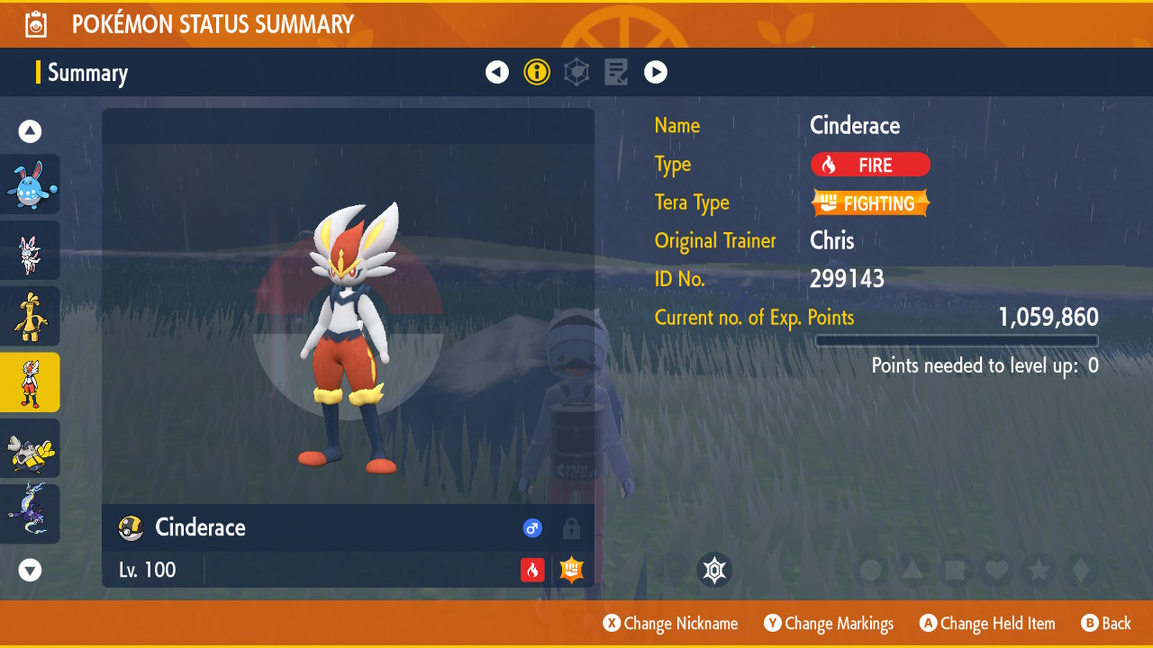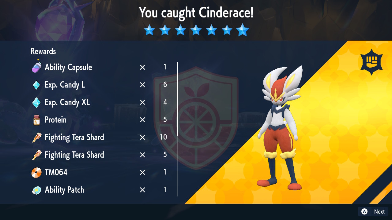 As promised ahead of launch, this Cinderace is a fighting Tera type (which can be changed), and is a fire type normally. Clocking in at level 100, the 7-star Cinderace came with the following moves (and the Libero ability):