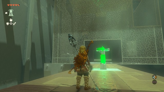 When you enter the shrine, walk towards the end of the platform and use Ascend to travel up via the overhanging pillar above. On the next level is an orange plinth. Unlike other plinths like this that you may have seen throughout Hyrule, this one has an arrow. This is to signify that hitting the plinth will turn the giant cube in front of you in the direction of the arrow. Hit the plinth for the first time to turn it green and move the giant cube around horizontally.