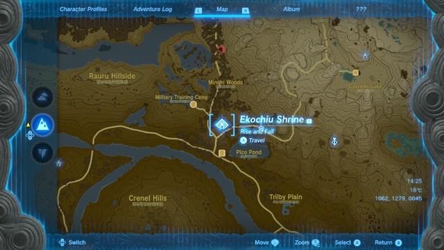 Alternatively, if you’re close to the start of the game, the Lookout Landing Skyview Tower is relatively near the shrine. To get to the shrine from Lookout Landing, use the tower and glide northeast past Hylia River and Crenel Hills. Check out the screenshot above to see the exact location of Ekochiu Shrine on the map.