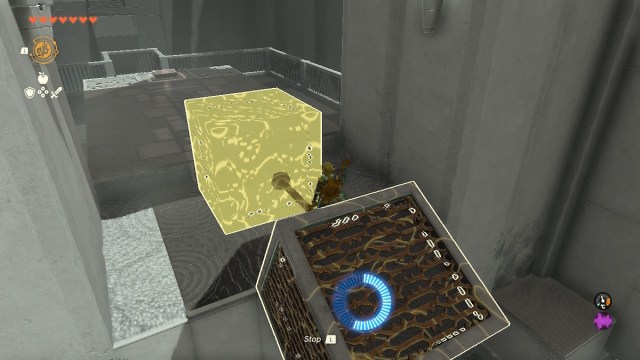 The final room is where things get pretty tricky. You have a similar situation to the first room, with a button that activates a catapult. However, it’s difficult to get the timing right here. To begin, use Ultrahand to pick up the climbable block on the floor to the right of the entrance. Place it on the platform on the same floor, closest to the shrine exit. Head back up to the top, and you can activate the catapult to send the block flying.