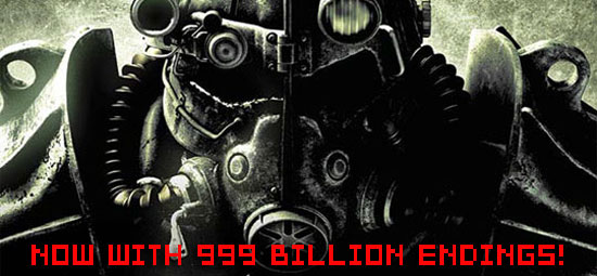 Two hundred endings. See, I love me some Fallout, but this is the kind of sh*t that gives gamers a bad name. Of course, I applaud the creativity and time it must take to create two hundred endings to a game, but you know hardcore Fallout fans are going to try to get as many of those endings as they can, which means no life outside of playing the game and maybe going to a day job if you don’t quit the damn thing so you can have more time to play Fallout.