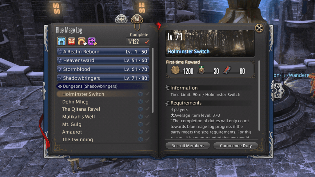 Once you’ve completed the level 60 quest “Blue Scream of Death”, you’ll have access to the Blue Mage Log and a whole new opportunity to earn Allied Seals becomes available to you. To see what’s in your Blue Mage Log, open up the Blue Mage Spellbook from the menu and switch the tab in the pop-up window.