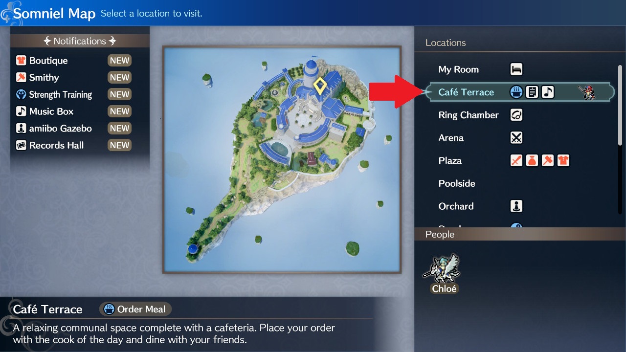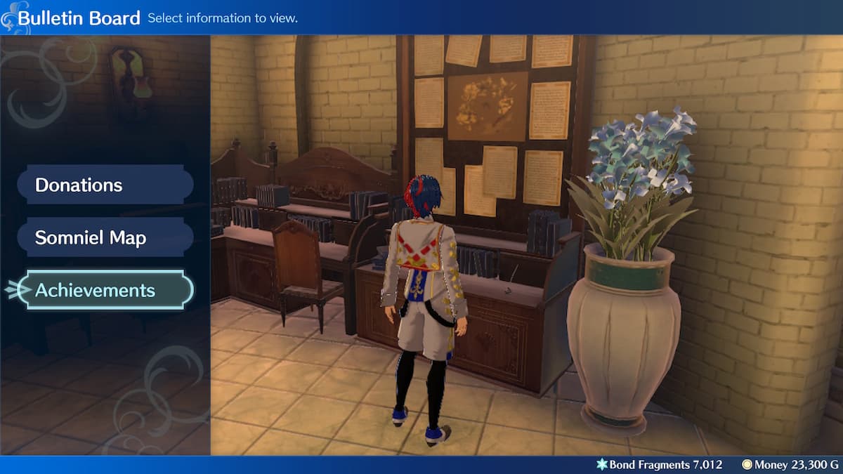Located directly in the Cafe Terrace against the wall to the left of the cafe counter is the Bulletin Board. You can do several things here, including donate to other nations (which provides bonuses in exchange for lump sums of gold), navigate the Somniel map (which you can do anyway through the X button anywhere in the Somniel), or browse achievements.