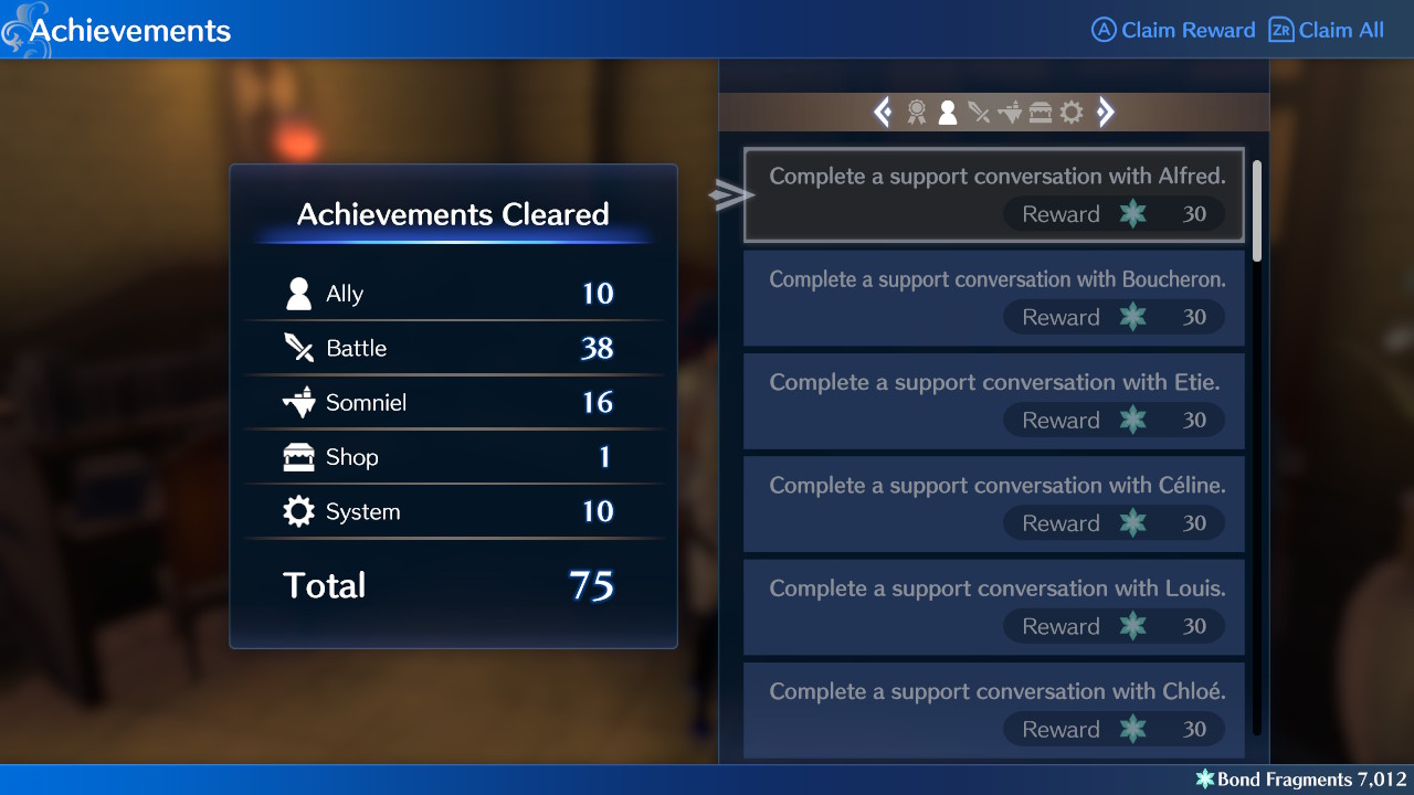 Once you’re actually in the achievements menu, players are able to browse through potential targets/goals to hit, and claim completed [cleared] achievements. By manually triggering completed achievements, you’ll get Bond Fragments, a currency that primarily deals with the Emblem Ring system, and the support mechanic inherent to Fire Emblem Engage.