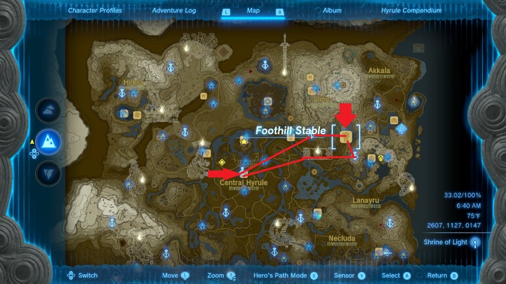 The Foothill Stable is due east, far beyond Central Hyrule and the Eldin Canyon. It can be located east of the Eldin Canyon Skyview Tower, and north of the Upland Zorana Skyview Tower.