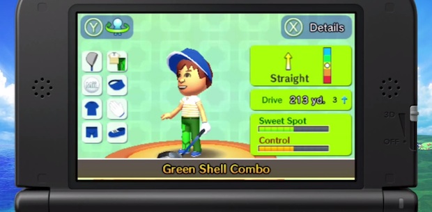 Today, Iwata showed off a new mode that lets you use your Mii characters to play through the game. The eight items you can purchase at the shop (clubs, balls, clothing, and more) can be equipped and used. You’ll be able to customize your Mii and then take it into tournaments.