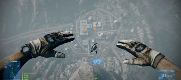 As the fight wore on, I came to realize that the whole base-jumping aspect is just one part of the excitement of this map. Granted, it’s an awesome sequence, and I even laughed when I ran off the side and pulled a smoothly animated running man mid-air before I decided to pull the cord. The control is much better when parachuting than it ever was in Battlefield: Bad Company 2, as you can actually steer yourself a lot more in a way that’s reminiscent of Pilot Wings. However, there are other ways to get down the side of the mountain, including the aforementioned helicopter.