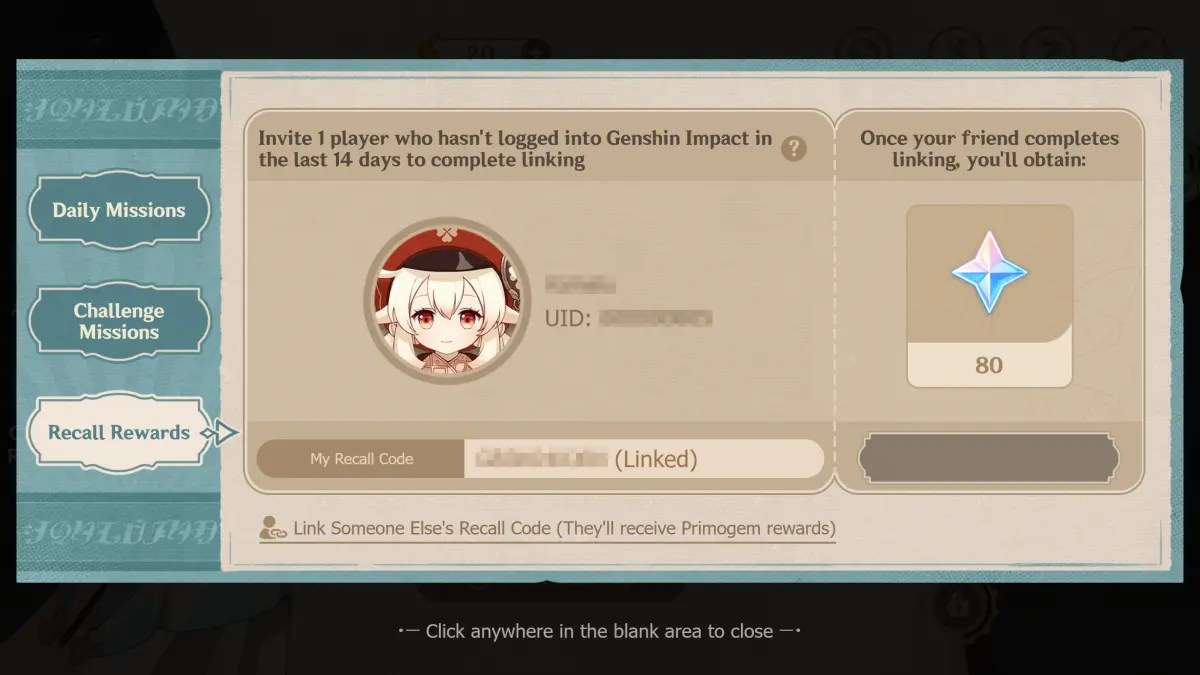If you have a friend (or an alt account) that is at least Adventure Rank 10 and hasn’t logged into Genshin Impact in at least two weeks, have them access the event page. Tell them to navigate to the Recall Rewards screen and give them your Recall Code. If they enter your Recall Code on their screen (and their account meets the returnee requirements), you will receive 80 Primogems via in-game mail.