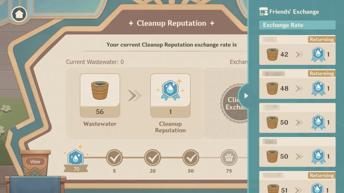Wastewater can be exchanged for Cleanup Reputation at a variable rate. Clicking the small arrow at the right side of the screen brings up your friends list. If a friend has a better exchange rate than you do, you can make exchanges at their rate, provided they have logged into Genshin Impact that day. Lower is better. The goal is to spend less Wastewater per Cleanup Reputation point.