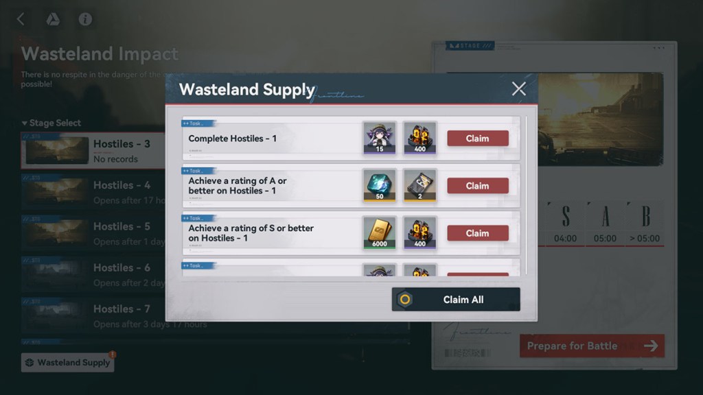 You can claim a total of 22 sets of rewards by playing Wasteland Supply. As you can see below, you will be able to unlock all of them by completing each of the mode’s stages with a good enough ranking.