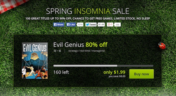 Games like Divinity: Dragon Commander Imperial Edition, Papers Please, and Leisure Suit Larry: Love for Sail are on the list, but the deal is that games will be on sale only one at a time in limited number of copies. When the counter runs down, another game comes up for sale. Sometimes these sales only last a minute or two. I just watched Evil Genius melt away before my eyes with its 80 percent discount.