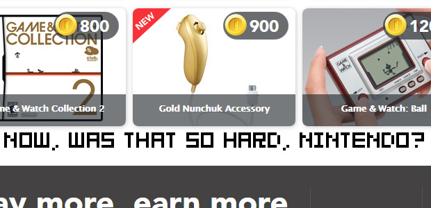 Despite denying that us filthy gaijins would ever get our mitts on the Gold Nunchuk available on the Japanese Club Nintendo, Nintendo has finally relented. It’s in limited supply, but now you too can own a Gold Nunchuk for a scant 900 coins!