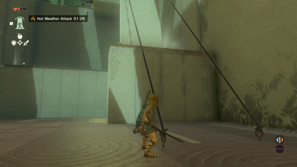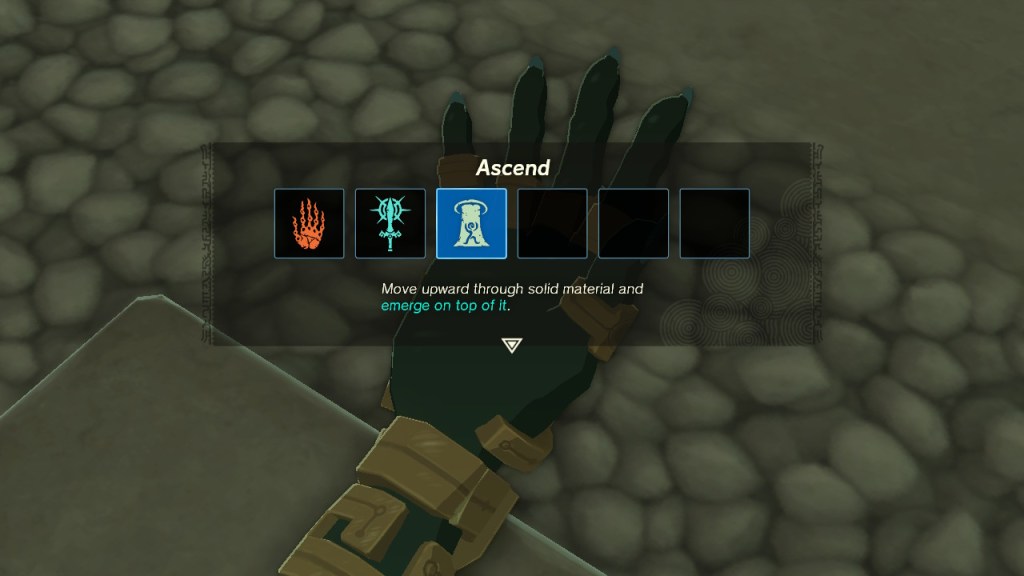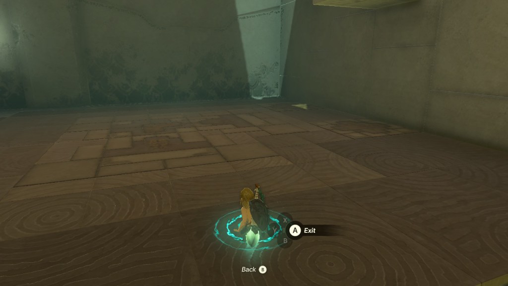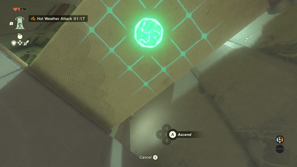 This shrine, like the one for the Fuse tutorial, is super simple. Your job is to have Ascend equipped at all times (using the L ability wheel) and just…ascend upwards. To use Ascend, you just need to be underneath a reachable platform and use the ability. You’ll rise up off the ground and essentially teleport into the platform while stuck in the ground. Press A to “exit” and leap off the platform, or press B to go back and fall downward where you originally were.