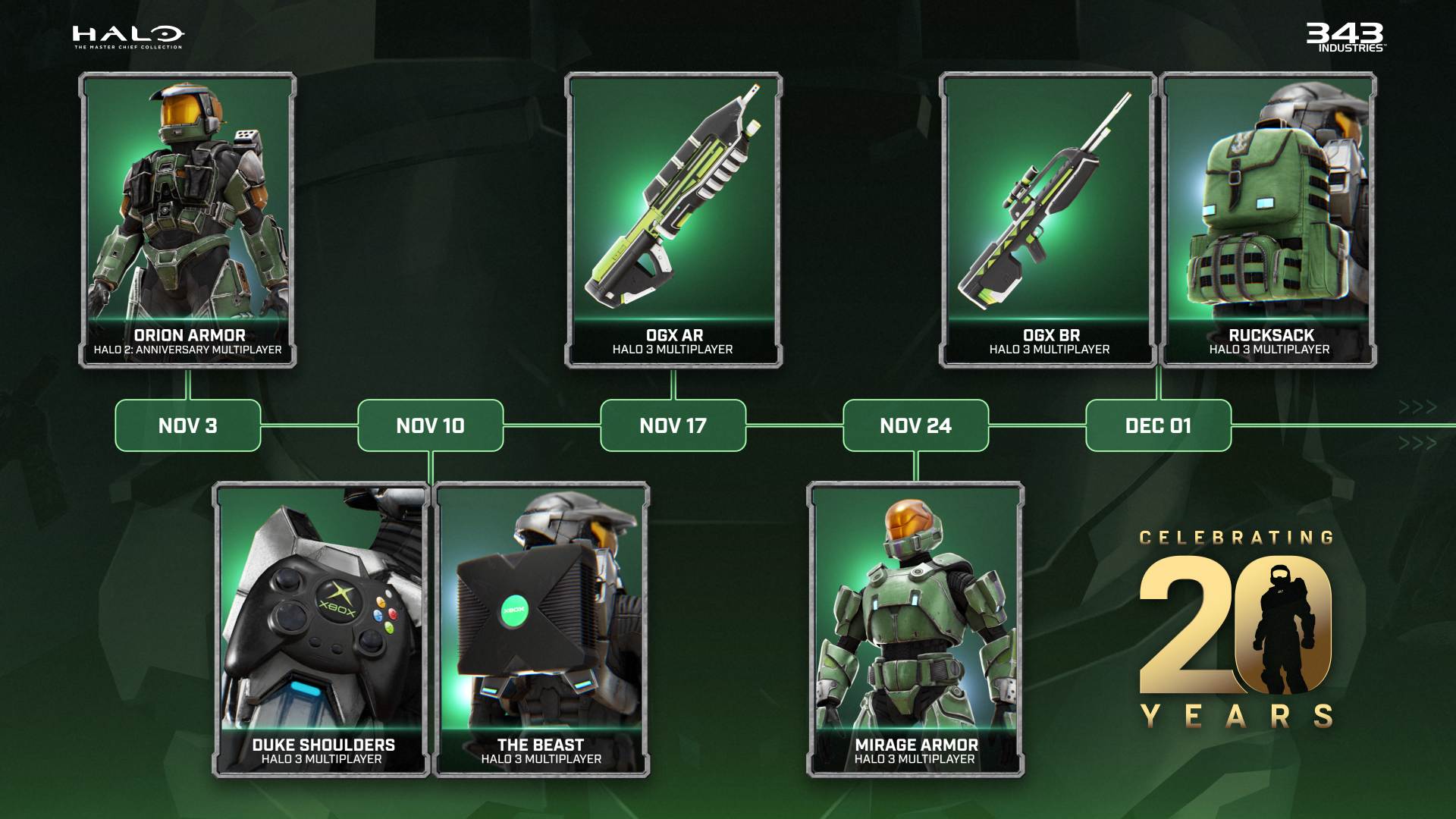 From November through January, Halo 20th Anniversary themed content will roll into the Master Chief Collection. These will be purchasable through Season Points, and will be added to the collection starting today with the Orion Armor set for Halo 2: Anniversary.