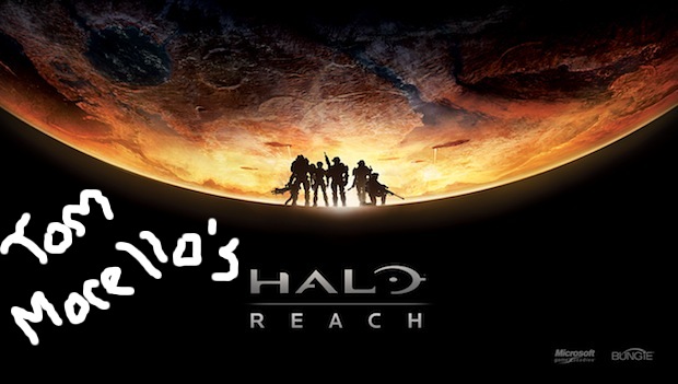 If you squint real hard at the little people in the Reach promotional ad that shipped with copies of Halo: ODST, you can see an ODST in the middle of the image. Also, twinkles and lights — but that was shortly before we lost conciousness.