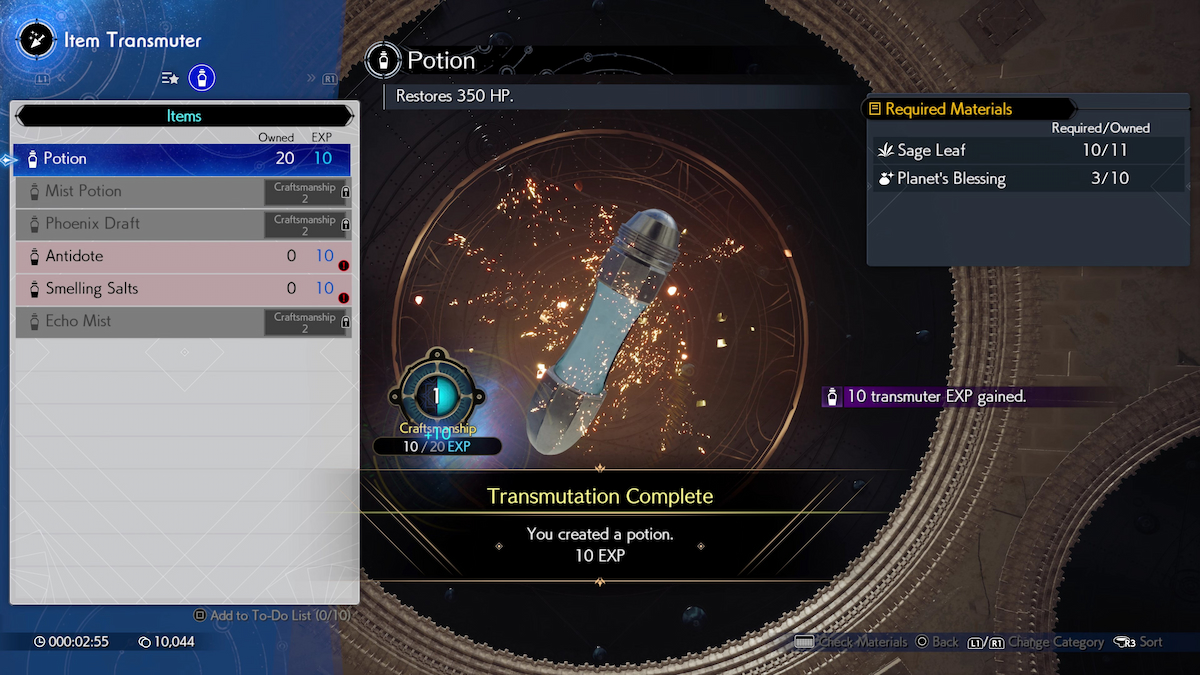Right off the bat, Final Fantasy 7 Rebirth hit me with several mechanics that one would immediately think of when they hear “open-world.” I could ride my chocobo mount, pick up materials off the ground as I walked by them, and chase down optional battles to engage in. In the demo, those random materials could only go into crafting consumable items. The big thing here is the Cushion, which Cloud must use if he wants to rest on shoddy looking benches. Honestly, I can relate. My butt deserves only the best too.