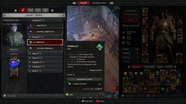 By visiting the Jeweler, you can take multiple gems of a certain condition and combine them into a single stronger Gem. This way, even the worst Gem you find can become useful. Unless you specifically need multiple copies of a certain type of Gem, I recommend fully crafting your Gem collection as much as you can. I personally like to put my Gems in storage, and when I’m looking to upgrade my gear, I craft as much Jewelry as I can before deciding which equipment I want to upgrade.