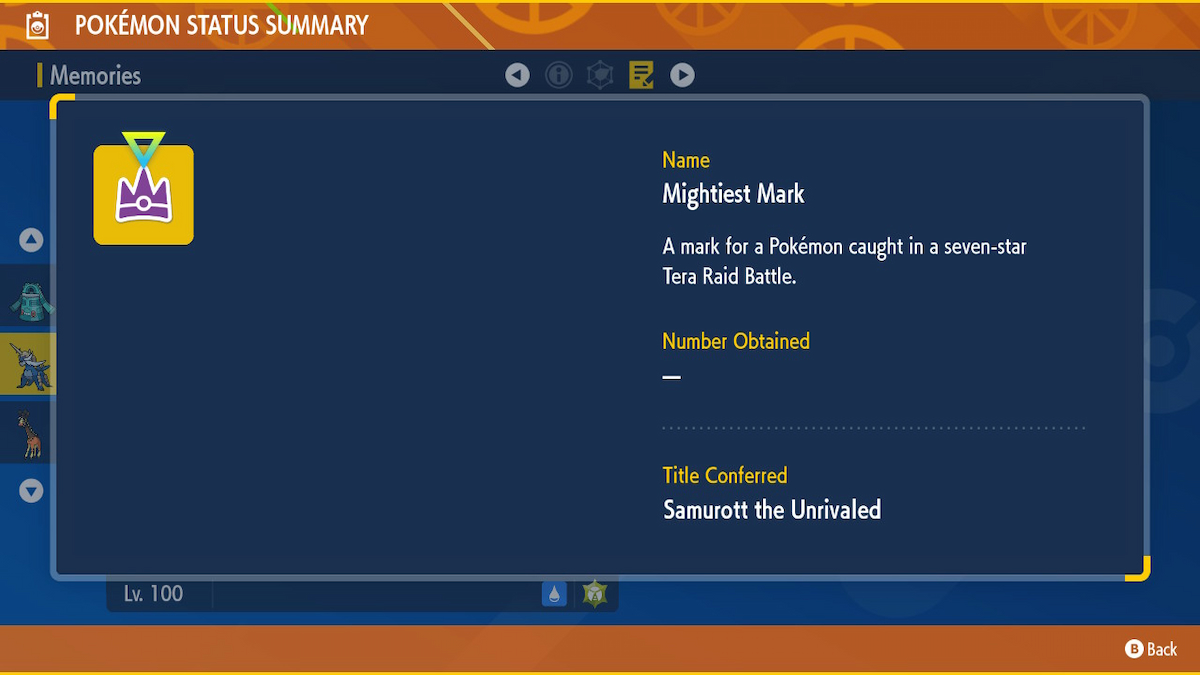Also like past 7-Star encounters, Samurott will have the Mightiest Mark. This grants it the title of Samurott the Unrivaled.