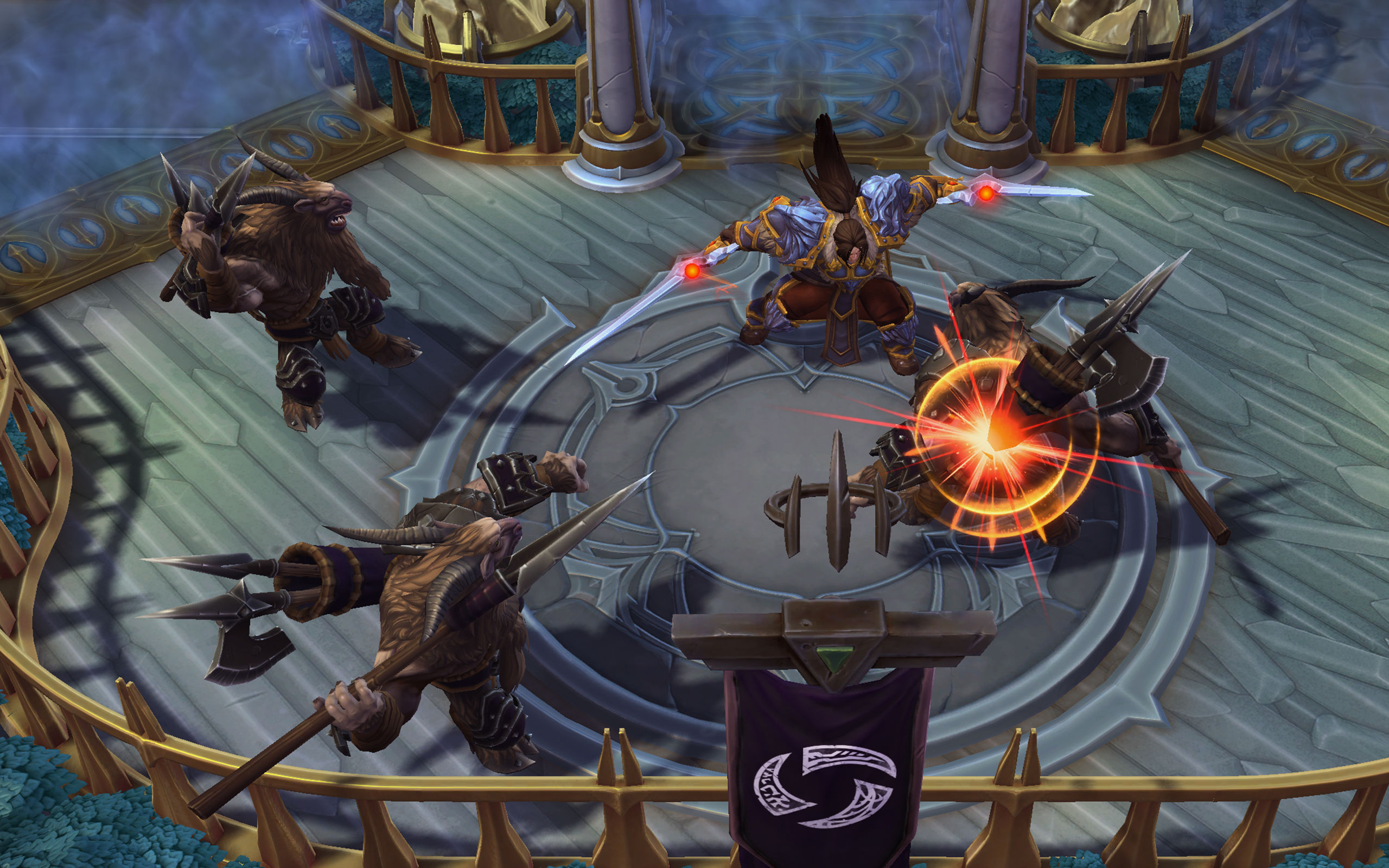 His kit involves a line skillshot sword slash, the aforementioned parry (which mitigates physical damage for 0.75 seconds), and a charge, which can be talented to double as a stun. Varian’s passive Heroic Strike grants you bonus damage every 18 seconds untalented. If you go for the Taunt heroic ability (which forces an enemy hero to attack him for roughly a second), he’ll get a passive health increase by 50%, and an attack speed decrease of 25%. If you go for Colossus Smash (a single target attack that can be talented at 20 to hit multiple foes), he’ll get a 75% attack damage increase, and a 10% health decrease. Finally, “Twin Blades of Fury,” a third choice, increases attack speed by 100%, and reduces his base attack damage by 25%, granting him a shorter cooldown on Heroic Strike if you keep attacking heroes.