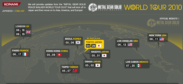 To promote Metal Gear Solid: Peace Walker, series daddy Hideo Kojima is doing a sort of “world tour.” I’d type out a list of locations for you, but the above picture does a pretty good job of letting you know where he’s going.
