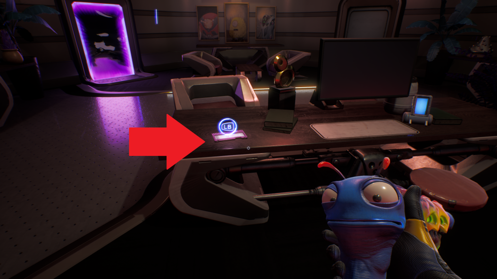 This step is simple: grab the keycard off his desk, and return through the portal home. You’ll be using it in the next area.